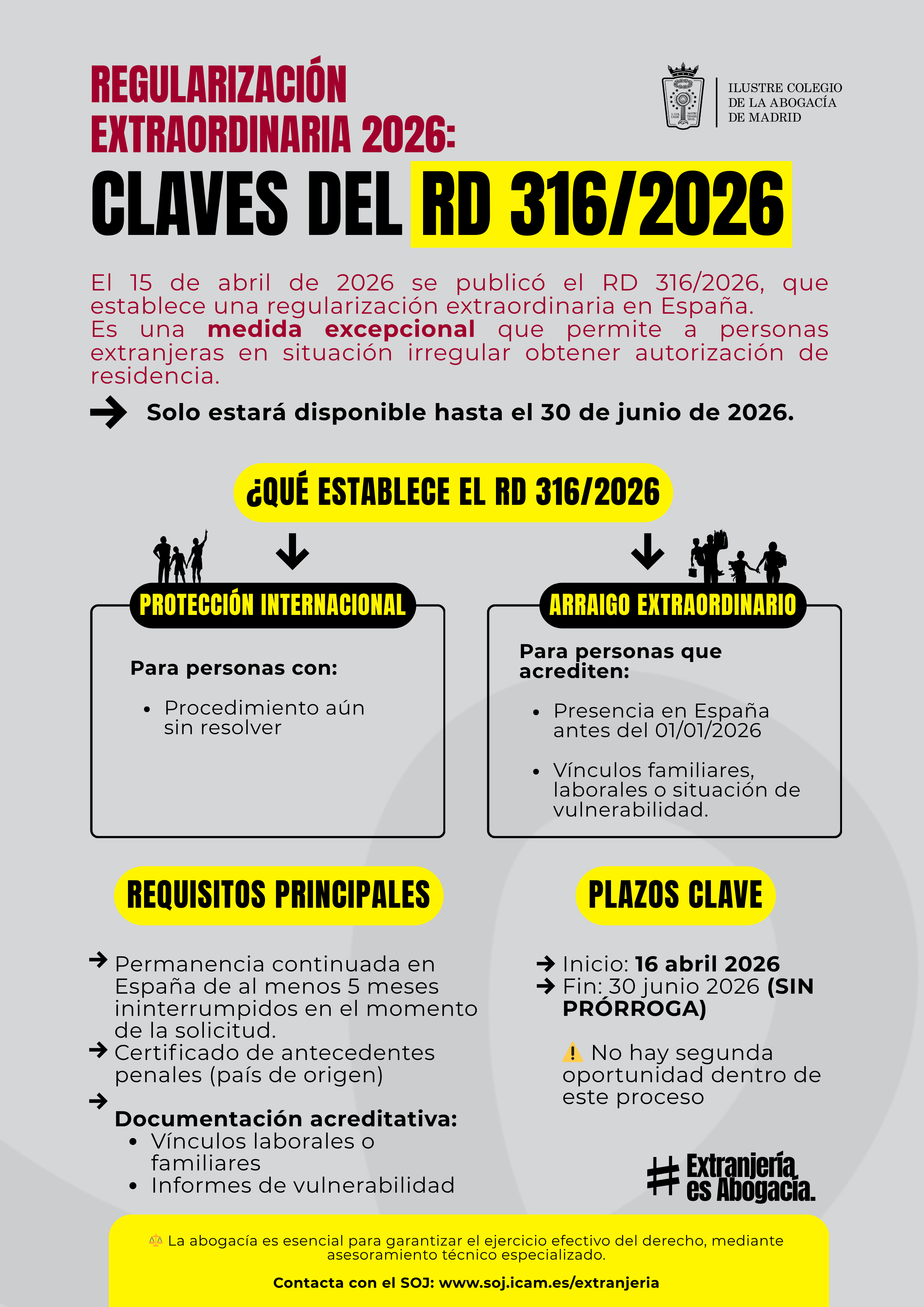 Coincidiendo con la entrada en vigor del proceso de regularización extraordinaria de personas extranjeras, regulado por el Real Decreto 316/2026, de 14 de abril, publicado ayer en el Boletín Oficial del Estado, el Ilustre Colegio de la Abogacía de Madrid (ICAM) ponen en marcha la campaña “Extranjería es Abogacía”, con la que pretende reforzar la visibilidad de la abogacía especializada y trasladar a la ciudadanía la importancia de contar con asesoramiento jurídico cualificado en todo el proceso de regularización extraordinaria.