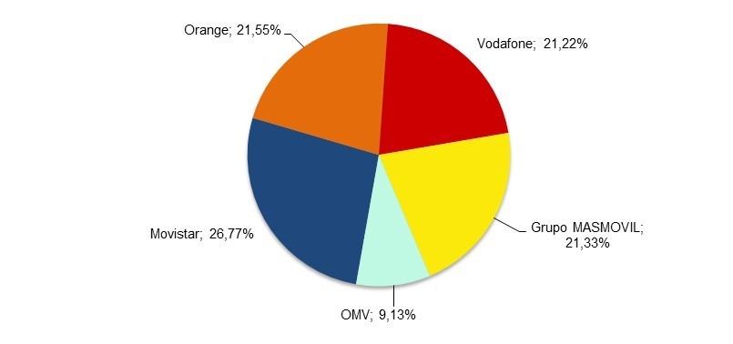 Movistar, Orange y Grupo MasMovil representaron el 69,7 % de las líneas móviles del mercado.